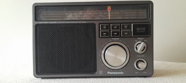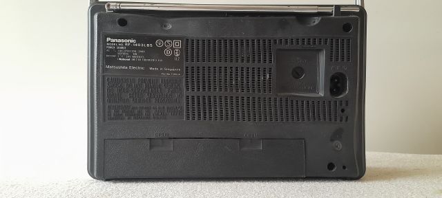 Marque Panasonic, modèle RF-1403LBS, N° 1DAPB0436 , début 80. Fabriqué à Singapour par Matsushita Electric, gamme PO-GO-FM, piles et secteur. M/A par bouton poussoir. Prise écouteur, sélecteur de tension 110/220 volts.